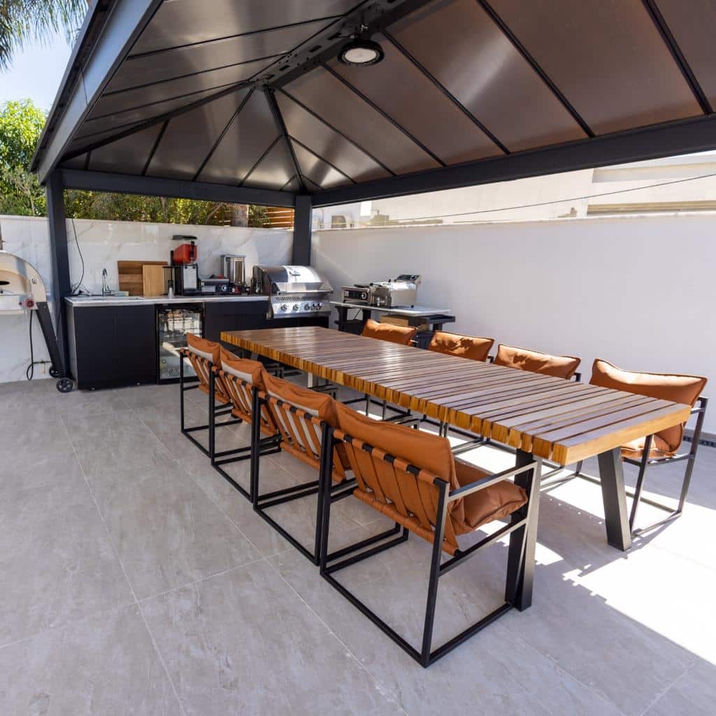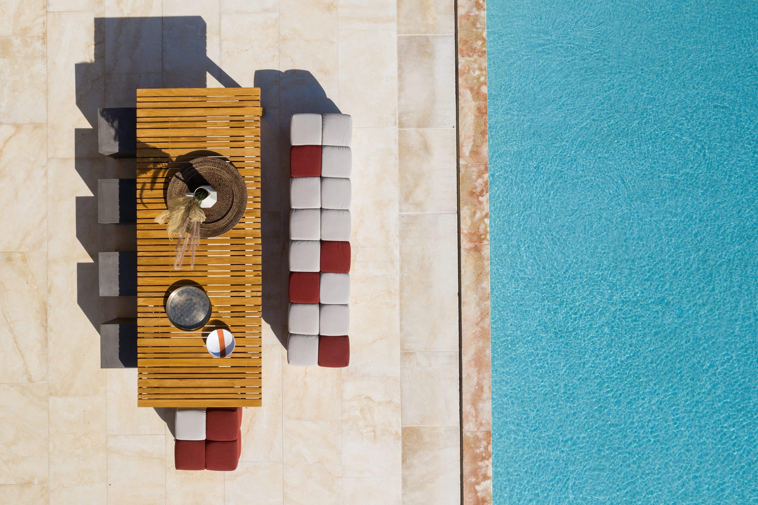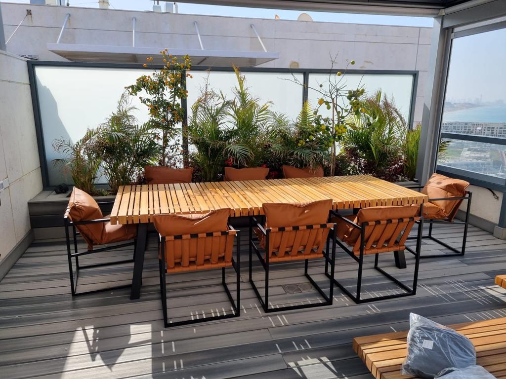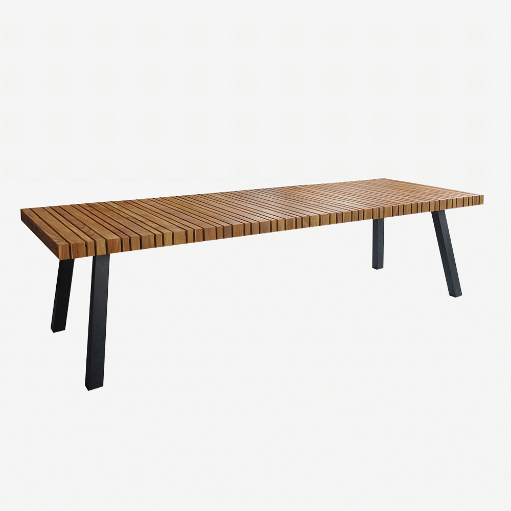 שולחן מעץ טיק יוקרתי בשילוב רגלים מאלומיניום, השולחן במראה מודרני בשילוב סרגלי עץ טיק במידות שונות המקנות לשולחן מראה יוקרתי ומיוחד.